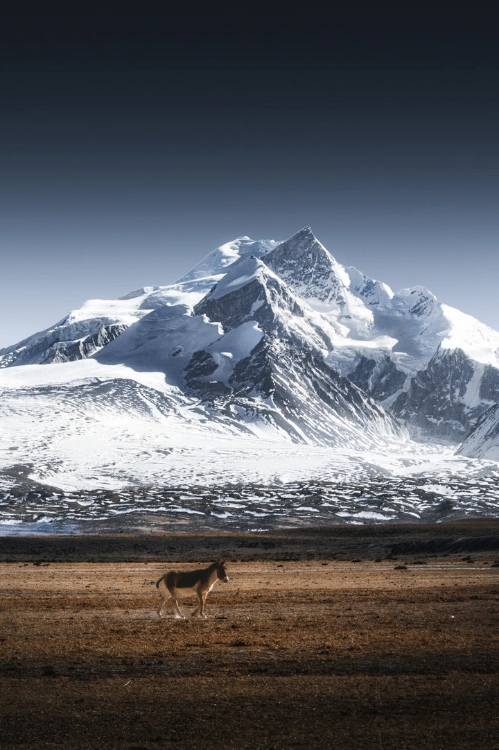在青藏高原的寂静腹地,一座无名的雪峰以亘古的姿态矗立于天地之间。它的峰峦嶙峋如刀削,终年不化的积雪在稀薄空气中泛着冷冽的银光,仿佛时间在此凝滞。山脊的褶皱间藏着风的形状,云影从岩壁上缓缓爬过,留下明暗交错的叙事。 画面下方,荒原以大片枯黄草甸铺展,地表龟裂的纹路如大地衰老的掌纹。一匹深褐色的骏马垂首立于其间,鬃毛被高原的风拂向一侧,马尾轻扬,马蹄下是碎砾与冻土。它并不急于奔走,只是静静伫立,脖颈弯成一道温和的弧,仿佛在聆听远处雪崩的余响,或是在辨认风中草木复苏的气息。 光从西侧斜射而来,将马的身影拉成长长的寂寥。雪山在逆光中化为一道朦胧的剪影,与马驹渺小的轮廓形成浩瀚与微末的对话。近处草色苍凉,远处冰峰凛冽,生命与永恒在此刻被压缩进同一帧画面——没有嘶鸣,没有奔腾,唯有旷野的呼吸与雪岭的沉默交织成篇。 这是荒野的哲学,也是孤勇的诗意。马匹成为天地书页间的逗点,暂留于雪域亘古的苍茫里;而雪山始终是那座雪山,见证过冰河消长,却依然在每一寸日光中重生。当镜头定格,风继续吹过佩枯措湖畔的砾石,希夏邦马峰的影子在湖心荡漾,所有流浪的灵魂在此一瞬,与永恒打了个照面