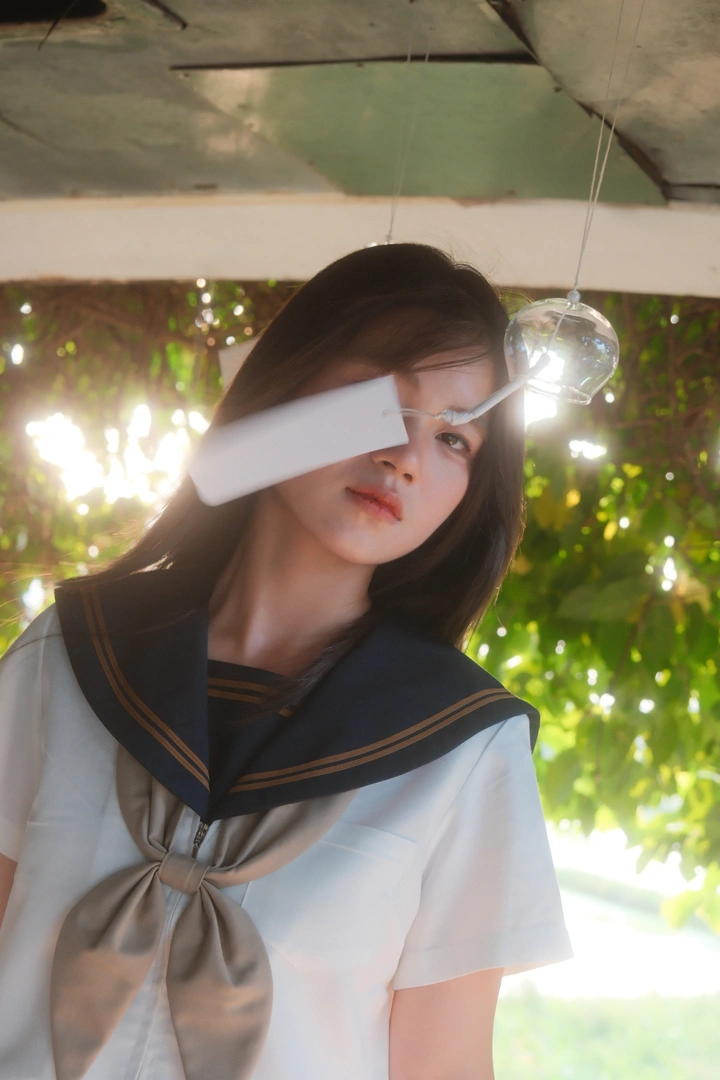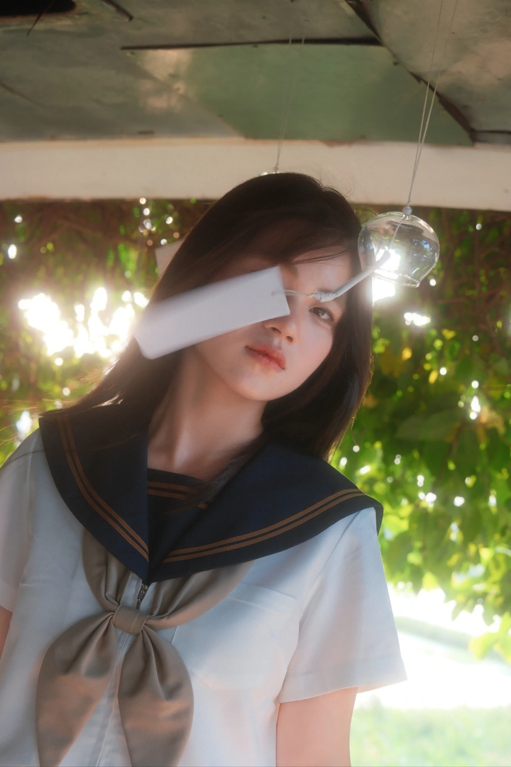 夏风裹着叶隙的光撞过来,檐下风铃悬成半阙诗——玻璃罩晃着碎金,白卡轻擦过眼尾,像青春不肯说满的心事。