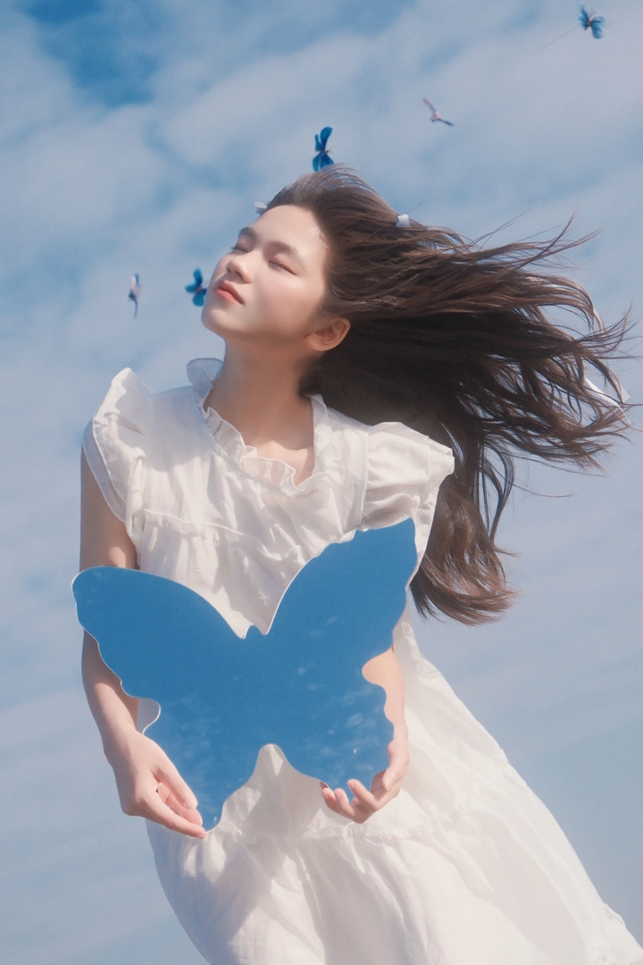 风掀起裙摆时,发梢先接住了蓝天的呼吸。几只钴蓝蝴蝶从云隙间跌下来,吻过她微扬的下颌。白裙是舒展的诗行,手臂向风的来处打开——此刻,青春不必具象,只消这一帧蓝与白的轻舞,就把晴朗攥成了掌心的软风