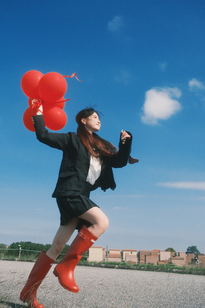 蓝天下的红气球是自由的注脚,风把发丝吹成舒展的形状。黑西装也裹不住雀跃的心跳,指尖轻扬就碰得到云的软。这一秒不用赶时间,就跟着气球飘一会儿吧——把生活的褶皱,都熨成天空的蓝