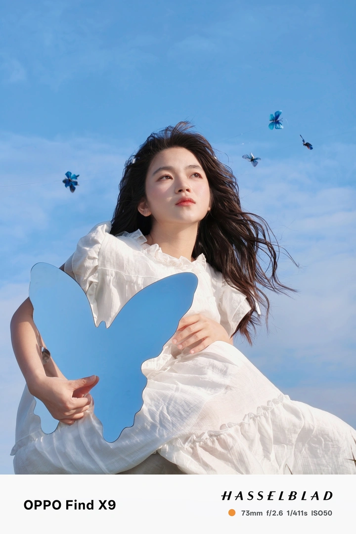 蓝空作幕,风掀动裙摆与发梢,她怀抱着蝶形镜,像拥住一整个轻盈的梦。镜面漾着天的澄澈,几只蓝蝶绕着光影翩跹——是夏的呼吸,揉进白裙的褶皱里,连空气都浸着温柔的碎光,每缕风都在说:此刻,浪漫刚好落满肩头。