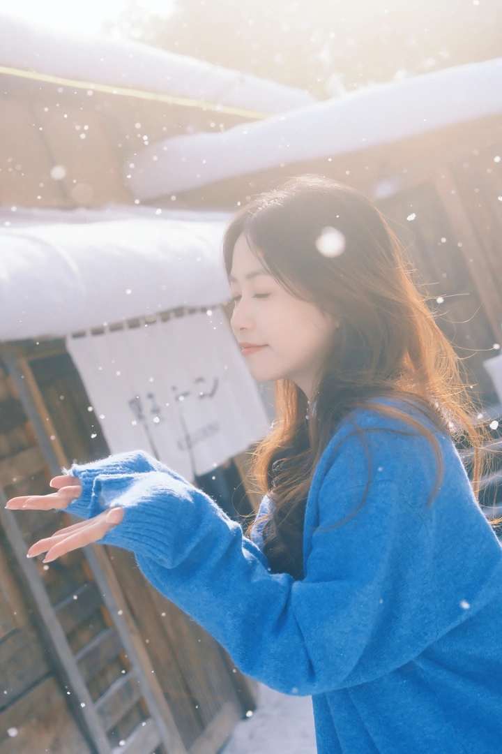 木屋里漏出的暖光裹着雪,我举着手等一片雪花落进掌心。宝蓝色毛衣浸在冬风里,却比窗纱外的雾凇更鲜活——原来冬天的浪漫,是接住细碎的白