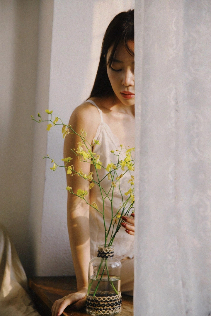 白色蕾丝与碎花裙角,阳光透过旧窗棂在肩头停泊。指尖轻触花瓶里的紫花,画架上的笔触与光影交错。赤脚踩在斑驳地板上,连呼吸都变得很轻——这一刻,我与自己的寂静深深相认。