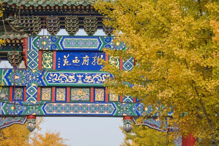 这条路,历年来变化最少,还保留着十几年前的样子,确切地说,它的一侧,还保留着百年、千年前的样子,因为那边是孔庙。高高的青砖墙,琉璃瓦反射出夕阳的光彩,加上从砖缝里生出的绿色植物,是黯淡中的一抹亮色。高墙内古老的柏树掩映着漆彩剥落的楼阁,灰绿的树叶,暗黑的树干,风吹雨打日晒后的深浅不一的红色,雕梁画柱上已然模糊不清的图案,在残败中有种历尽沧桑的美丽与苍凉。