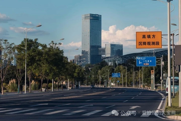 位于图片下方的柏油路及地面标识就是最好的引导线,将视觉引导至对面的建筑上,体现了纵深感。