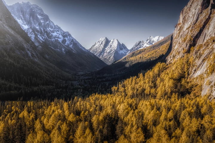 在四姑娘山的双桥沟,这里有大片的彩林和雪山,当从空中航拍,不受制于地面视角时,其独特的秋色的美才能完整地展现在你的眼前