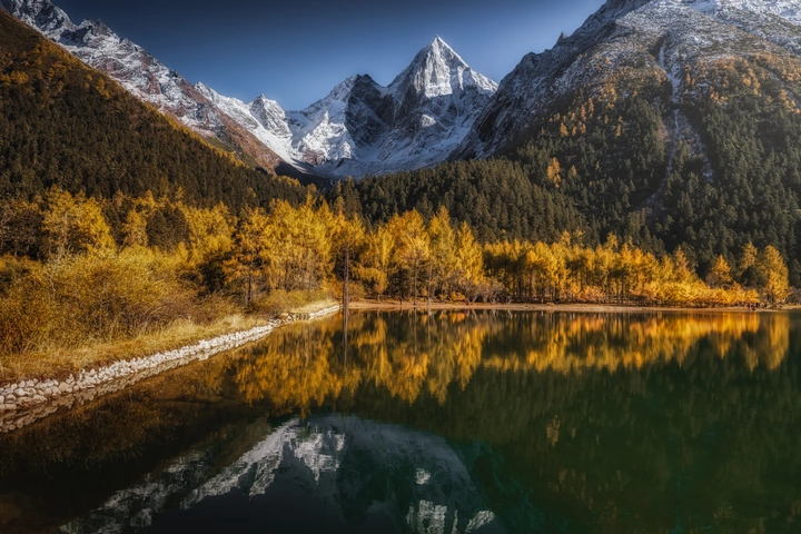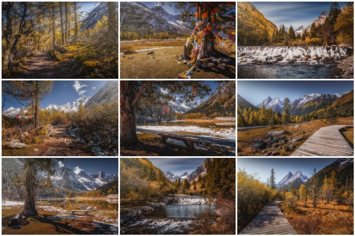 不知道各位有没有这样的感觉,秋色一定要和雪山配合才是最美丽的。当画面中有冷暖色碰撞时,秋天的味道才能更加浓郁