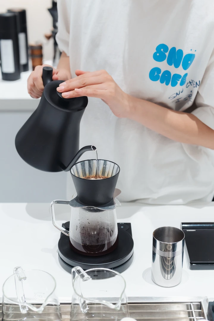 店名叫做SNÖ 如名字一样 里面就像雪花一样白 整体空间很大很通透 店里的留白较多 搭配大多都是黑色的咖啡机和磨豆机 还有黑色座椅 可谓是黑白搭配 从二楼往下看 左侧是手冲出品的吧台区域 右侧是磨豆机和咖啡机依次排放 中间则是一台咖啡机 喜欢通往二楼的楼梯 变换角度来看会有别样的感受 喝了一杯手冲 温度降低之后都没有什么涩感 入口很顺滑 蓝莓风味明显 有空想白天再来拍拍~