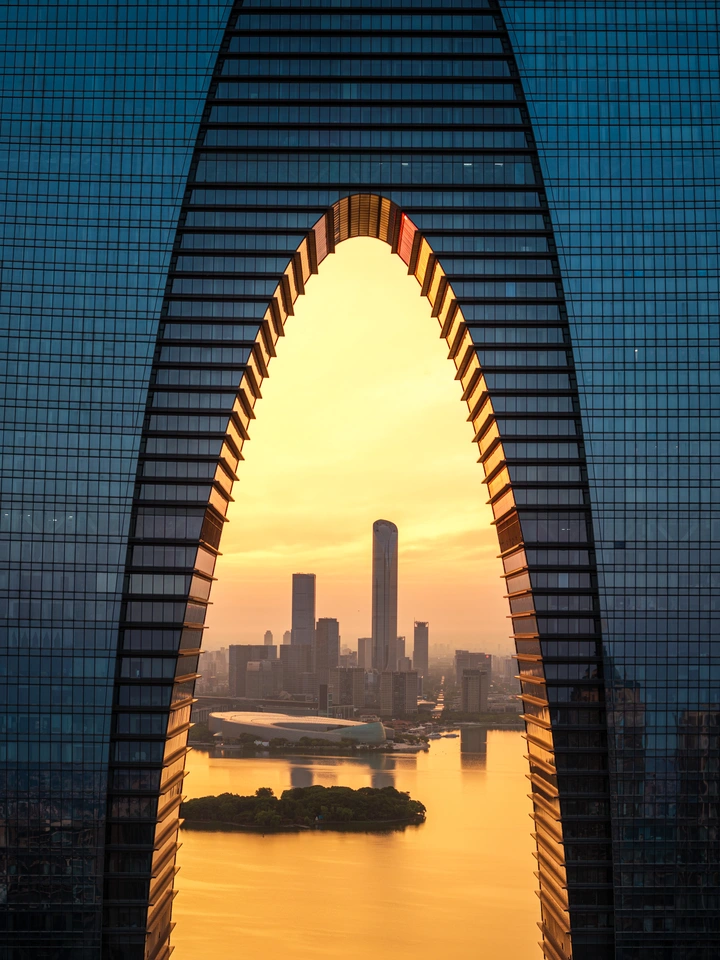 苏州金鸡湖的绝美朝霞,透过东方之门的拱门望去,金鸡湖变成了橘子海。日落把天际线染成温柔金橙色,远处的高楼、湖面倒影,像被装进了浪漫相框里,这是属于苏州的金拱门。