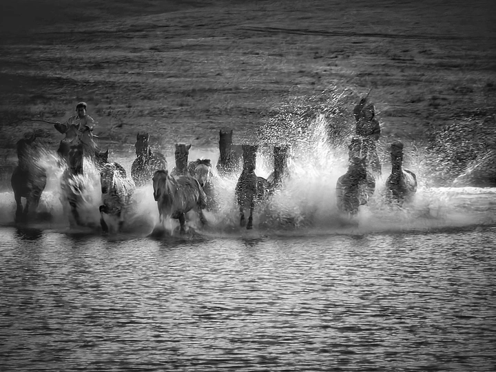 风掠过草原,马蹄踏碎晨雾,水花在黑白光影里迸溅成星。骑手的长鞭划破寂静,群马如墨色洪流,向着远方奔涌。每一次腾跃都带着野性的力量,每一声嘶鸣都撞碎在水面,又被风卷向天际。这不是逃离,是生命最本真的奔赴——向着自由,向着旷野,向着天地间未被驯服的辽阔。