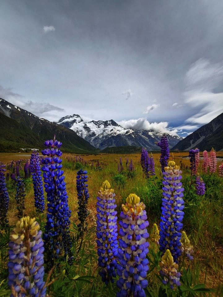 库克山的冰川在云间静卧,雪线如刀,刻画出南阿尔卑斯的脊梁。鲁冰花在谷底铺展成紫蓝的浪,用最热烈的色彩,吻着千年的冰。风穿过花海,把雪山的低语捎向远方,这是新西兰最动人的约定——冷峻与温柔,在天地间,恰好相逢。