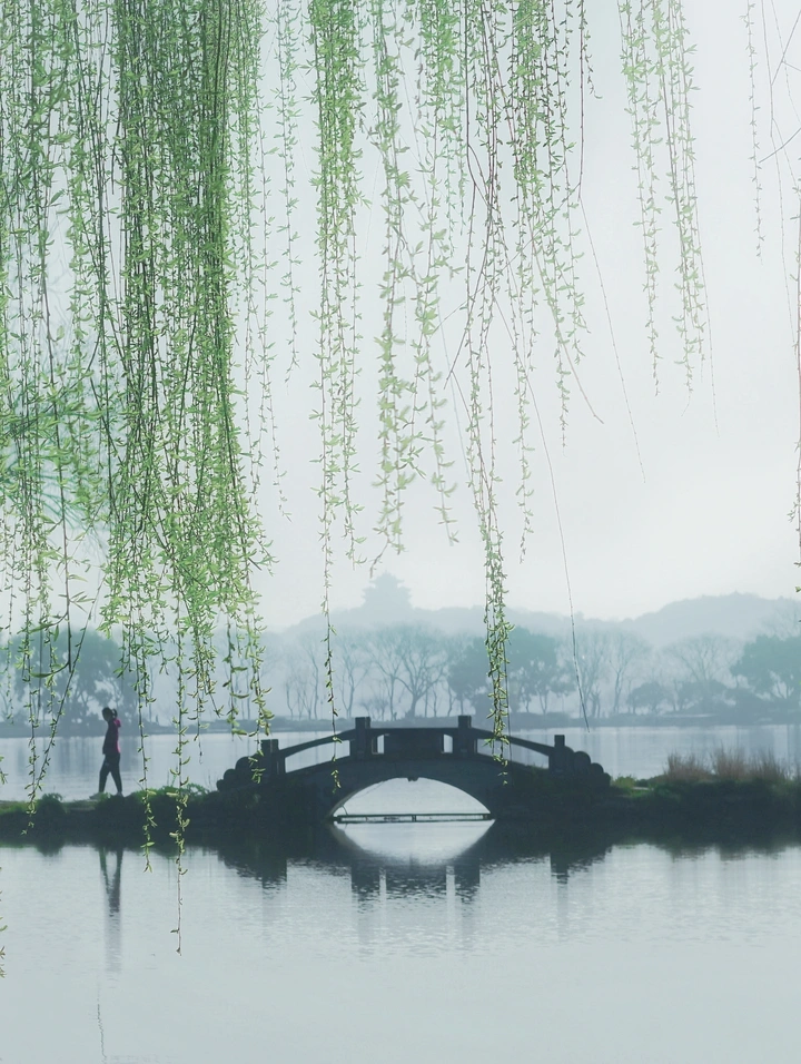 烟雨里的西湖,是老天爷打翻了水墨盘。柳条垂成绿丝绦,轻扫着石桥倒影;雾气把远山揉成淡墨痕,连人影都透着朦胧。水纹不动时,天地全装在湖里,像幅没干透的宋画,风一吹,墨色便活了。