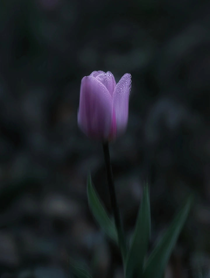 晨露凝在紫瓣上,暗调里藏着春的低语。一茎孤挺,在朦胧中轻颤,把温柔与清寂,都揉进这方寸光影里。