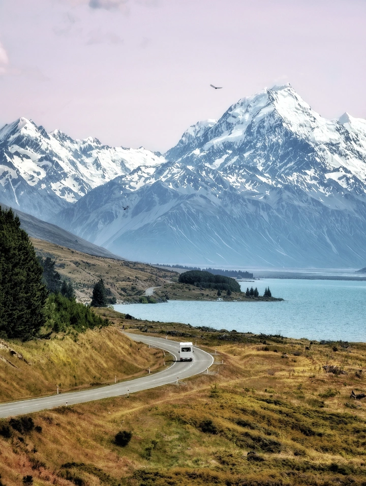 公路蜿蜒向远方,载着自由与向往,奔赴雪山与湖光的怀抱。蒂卡波的蓝,库克山的白,在粉紫的天际下铺展成流动的诗。风掠过草坡,鹰掠过山巅,每一寸风景都在诉说远方的浪漫。这一路,是与世界温柔相逢,是把生活的琐碎,都换成山川湖海的辽阔与晴朗。
