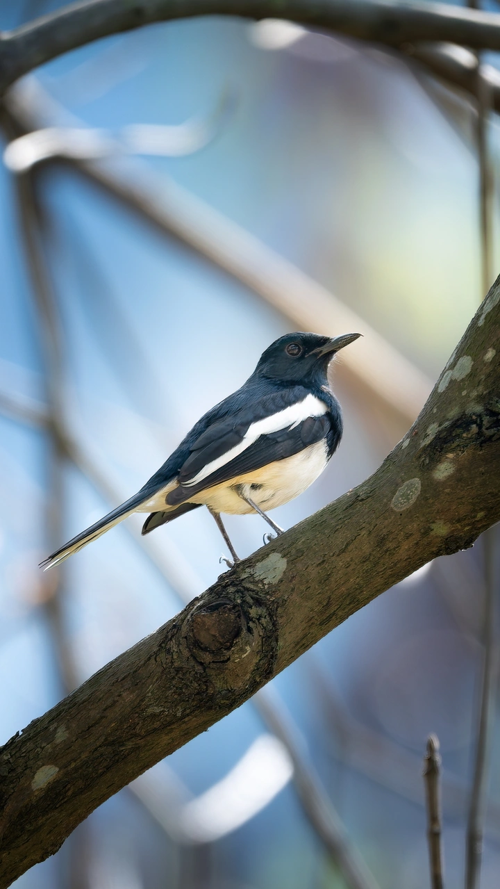 鹊鸲,学名Copsychus saularis,又称四喜鸟 。是雀形目鹟科鹊鸲属的小型鸟类,体长约19-22厘米 。 雄鸟头部和上体黑色且具蓝色金属光泽,中央两对尾羽黑色,其余白色,喉、上胸等部位亮蓝黑色,下胸和腹部白色;雌鸟上体多为黑灰或暗褐灰色 。 鹊鸲分布于中国长江流域及其以南地区,以及印度、巴基斯坦等南亚和东南亚地区 。主要栖息于亚热带和热带森林、灌木丛等地,也常出没于城市公园和庭院树上 。 它性格活泼胆大,不畏人,常站在屋顶或树梢鸣叫,叫声婉转多变 。以昆虫为主食,也吃植物果实与种子等,对防治农林害虫有积极作用 。2020年被列入《世界自然保护联盟(IUCN)濒危物种红色名录》无危(LC)物种 。