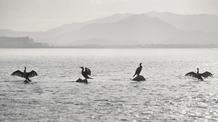 深圳湾公园的浅滩涂上,4只鸬鹚形态各异,仿佛真正进行选美竞赛。