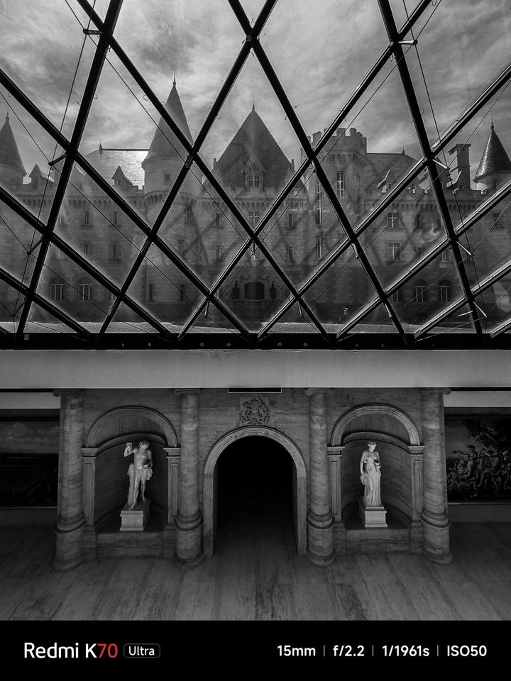 我们在拍摄建筑的时候,总是会找最熟悉的东西作为参照,都会在潜意识里去解读,我们最熟悉的自然是自己的记忆——每阅过一张照片,听过的一支音乐,路过的一段风景,看过的一部电影。 本次拍摄全程使用Redmi K70至尊版,15mm的超广角很容易拍出很有张力的大场景效果,拍摄建筑的外立面是最直观、最集中的体现了。对称,是一种庄重的沉稳美。多拍以对称为构图的照片总归不会出错。对称,给人以秩序的美感。尤其建筑的内部,看让我们目光向上心生畏惧的,实际是高大空间的尺度和惊人的长宽比例。这个时候选择15mm超广角再补充几张46mm的2x拍摄,会比较容易让观者对整个空间有个更为全面的熟悉。 不要吝惜你的快门,多尝试多角度的拍摄;多尝试黑白的光影(去除色彩的干扰,有时视觉会更加集中);多尝试对称构图,包括2x的局部构图;多尝试有前景遮挡的构图方式等,多尝试一定会有意想不到的拍摄哦。