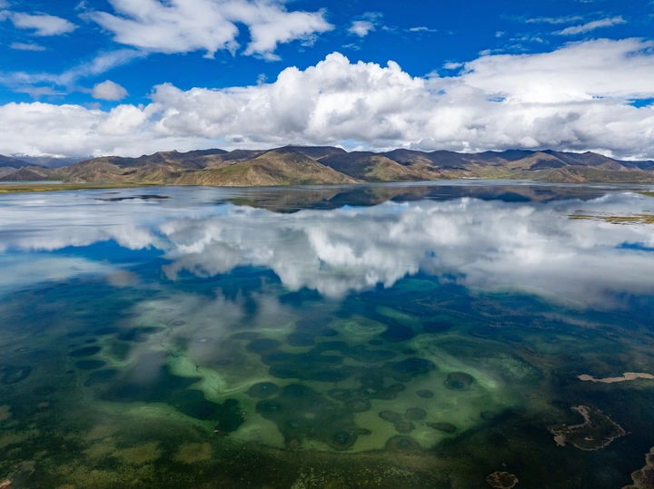 空姆错,羊卓雍措的卫星湖之一,湖水澄澈如镜,湖底的水草与矿物质让水面呈现出独特的纹理。