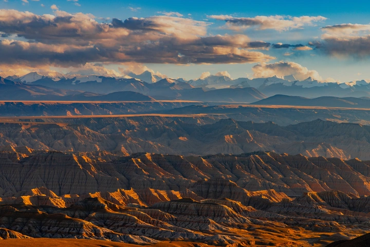 西藏阿里扎达土林日落时分,夕阳的余晖将这片由泥土构成的森林点燃,赭红与金黄交织的山体,在光影的变幻中呈现出令人震撼的层次。