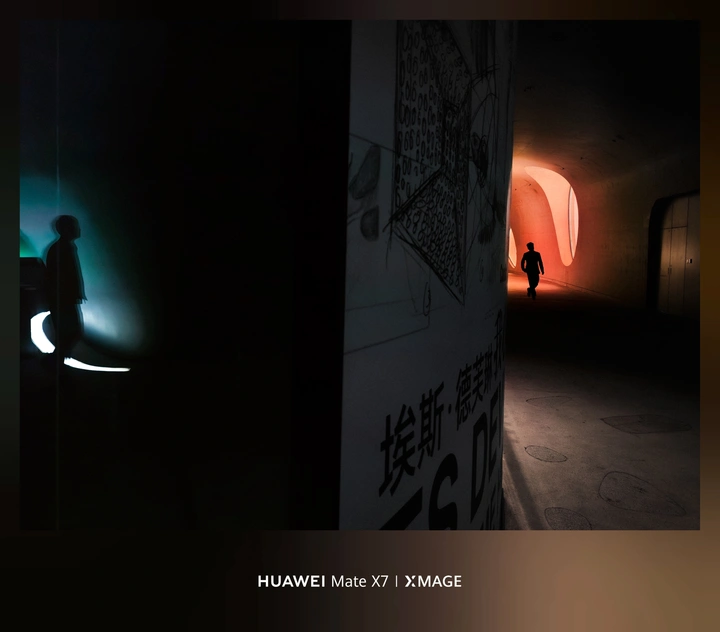 明暗切割出隧道般的空间,左边是冷调的沉默剪影,右边是暖光里奔赴的身影。 那些在暗里行走的时刻,总有些光会成为方向。