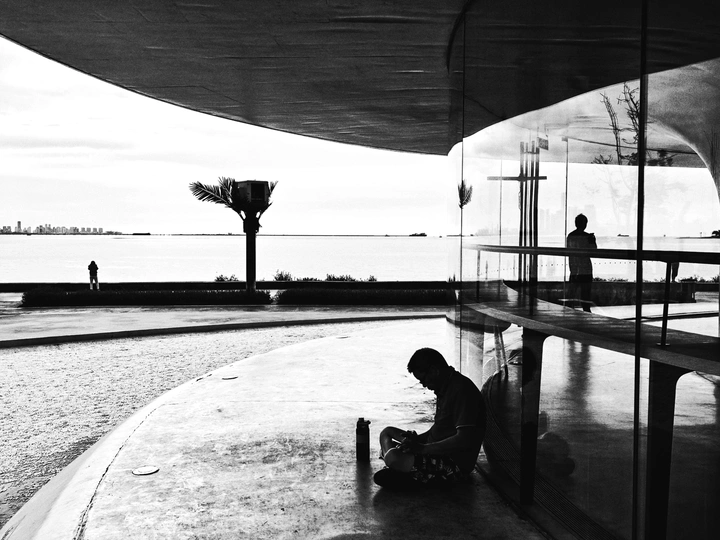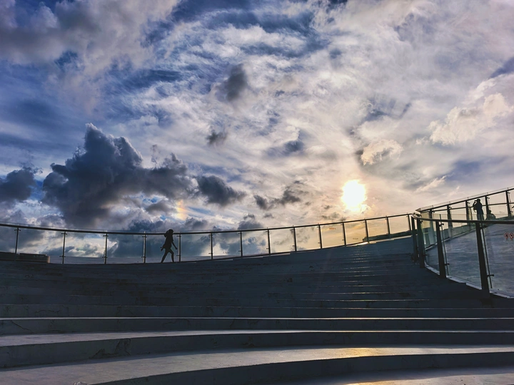 黄昏时分,海天一色,树影婆娑,泡泡飘散。远处的剪影,是生活的诗,也是归途的暖。
