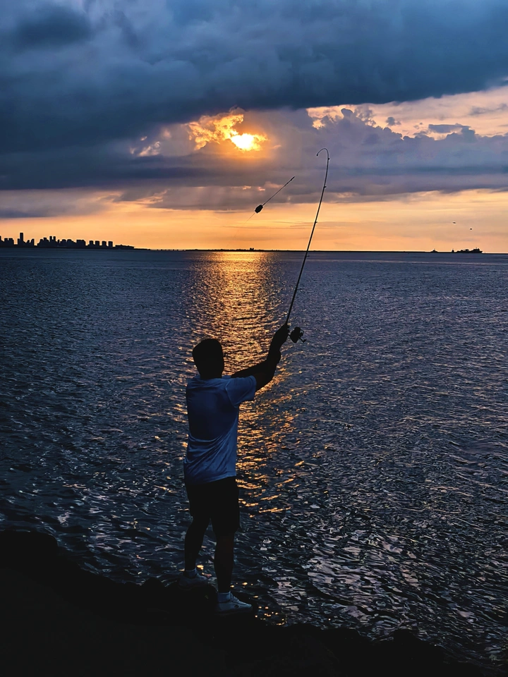 远方城市灯火渐起,眼前波光粼粼, 此刻人间,钓的不只是鱼,更是岁月的余晖。