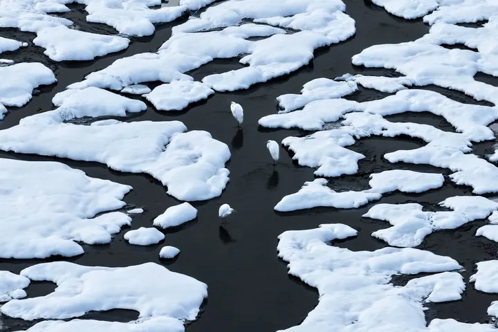 溪流是执掌冬风的裁缝,轻转间,大雪填平的坑洼,被吹开水塘一道道不规则轮廓,冰碎成纹,水凝作墨,白鹭踩着寒流站成三簇白
