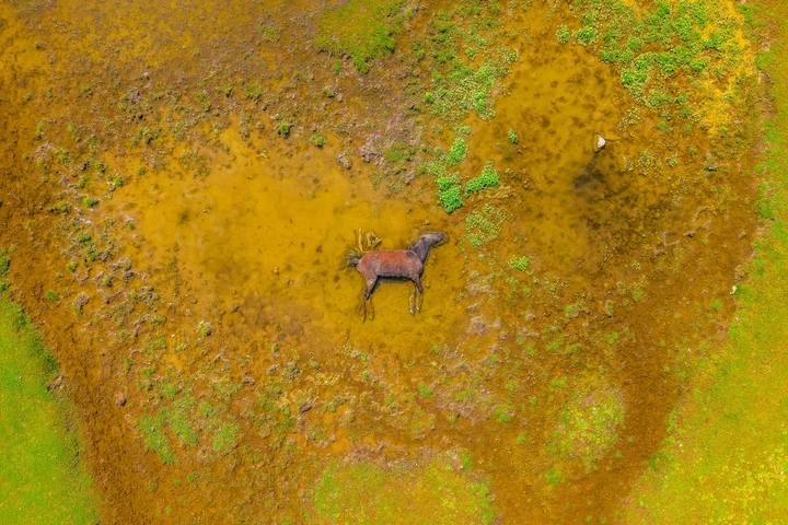 水位褪去后,湿地中出现一匹小野马,永久留存在这片大地,躯体瘫窝定格在这片广袤湿地,自然界万物轮回戛然而止的标本。