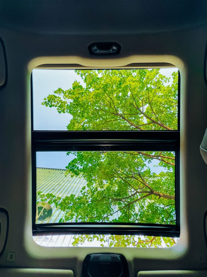 车缓缓前行,天窗之外,绿意正肆意舞动。阳光穿透枝叶,在天幕上洒下斑驳光影,树叶如同灵动的舞者,在风中舒展腰肢,沙沙作响。藤蔓垂落,似绿色绸带随风轻摆,与掠过的流云、飞驰的树影交织成一幅流动的画卷,为旅途增添了一抹鲜活的诗意。