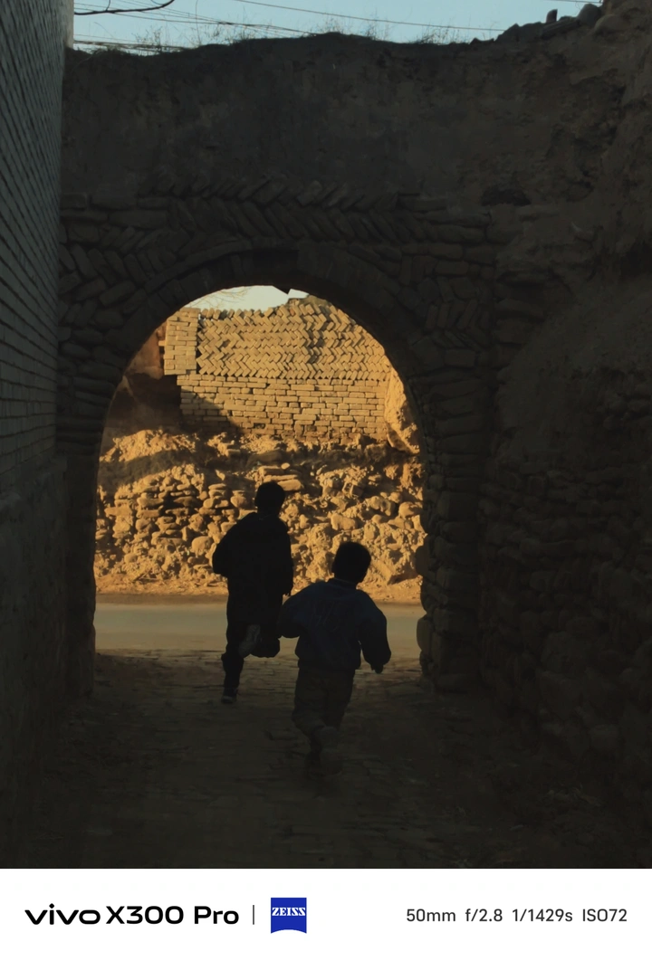 斑驳的砖石拱门如一道时光的剪影,将画面分割成明暗两界,两个孩子的剪影正奔向那片光亮。