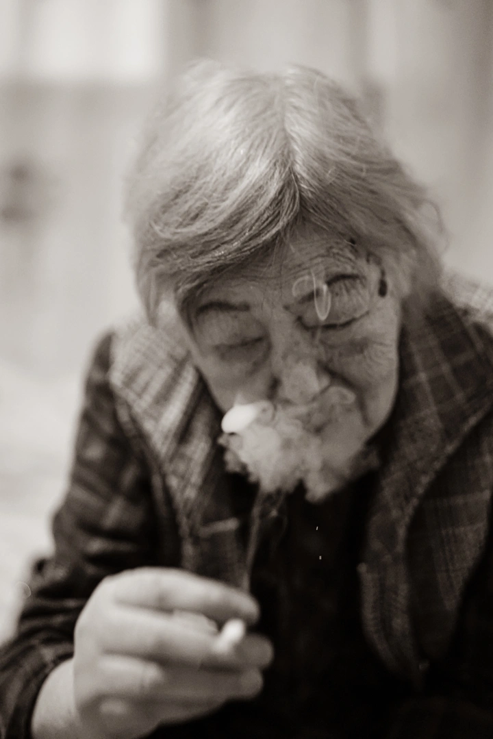 这张照片里,外婆的指尖被岁月和烟草染成了温柔的橘色,像被时光轻轻吻过的痕迹。她夹烟的姿势从容又熟悉,烟雾在她皱纹里缓缓散开,每一道纹路里都藏着故事。