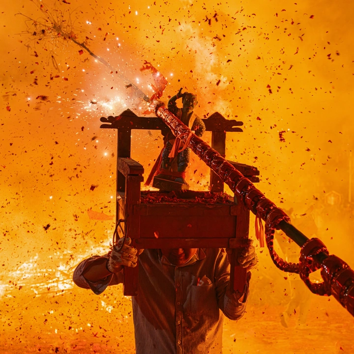 1张初六在揭西尖田村上演一场炸老爷的民俗活动。 现场点燃两大火堆,火光冲天,村里的年轻人举缠满鞭炮的长竹竿,在火堆点燃后,追着举起的神轿的人,鞭炮贴身炸响、火星四溅,场面狂野震撼。