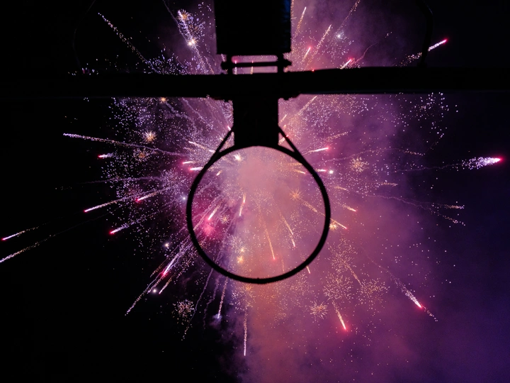夜空下,篮球框剪影框住绚烂烟花,紫红光雨在环内绽放,像给青春加了层梦幻滤镜,热烈又浪漫。