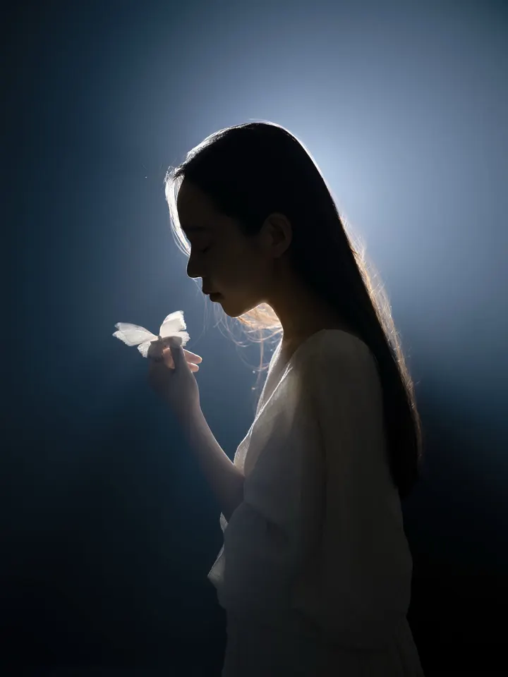 光线在人物与空间之间停留。 蝴蝶不是指向意义,而是一种被注视的瞬间。