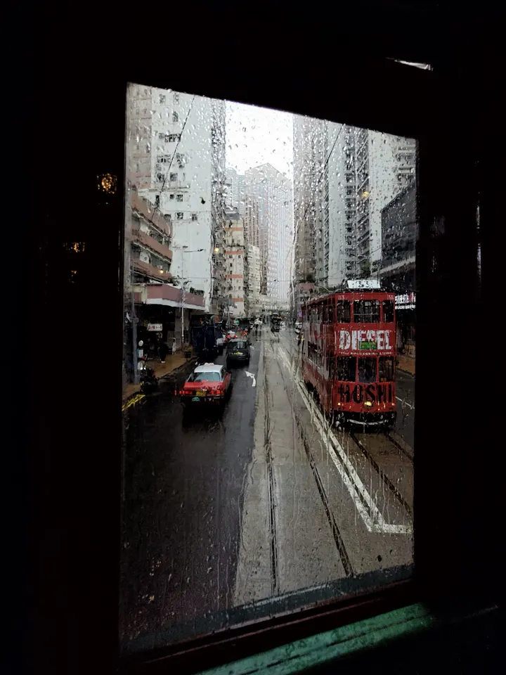 雨水把城市拉成一层薄薄的距离。 叮叮车向前,街道与时间一起后退。
