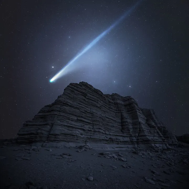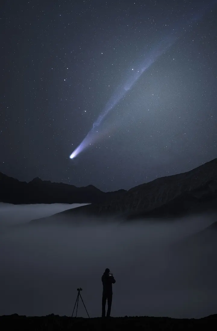 这颗彗星比去年哪个亮度要低,但是彗星的离子尾更长,形态更多变且拍摄时间更有优势! 拍摄器材:尼康z7ii+70-200f2.8+赤道仪 拍摄参数:地面3x60s、天空9x60s