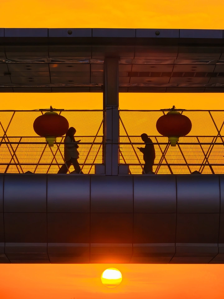 橙红晚霞漫过天桥,灯笼与行人的轮廓在暮色里晕成诗,落日恰好悬在楼宇之间,像颗被揉碎的橘子糖,把人间烟火都酿成暖调。