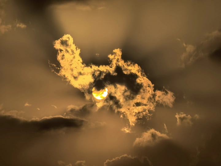 落日中云彩如同一只羊驼背着小羊驼在奔跑。