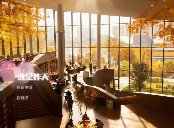天府艺术公园的图书馆里,深秋的诗意从玻璃窗外漫进来,又被满架的书脊轻轻接住。弧形的木质阶梯蜿蜒成流动的韵律,天窗漏下的光揉碎在书页间,像撒了一把细碎的金箔;窗外的湖水漾着薄雾,金黄的秋叶簇在枝头,风一吹,便有细碎的光影在书架与桌椅间游移。 有人埋首于书册,让思绪跟着文字远行;有人倚着落地窗,看秋阳把远处的建筑描成温柔的轮廓,连沉默的玻璃都晕染了深秋的暖。这里的时光是慢的,墨香混着草木的清芬,上帝之光似的光束斜斜切进空间,把书页的纹路、秋叶的脉络都照得清晰,仿佛每一个角落,都藏着秋与书撞出的温柔浪漫。