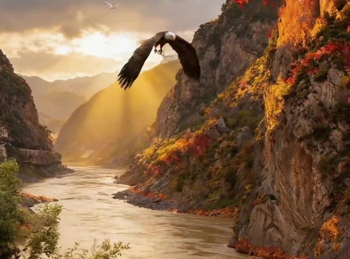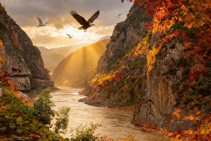 剑门雄关立千仞,壁立的山石如剑劈斧削,在深秋的风里凝着苍劲的风骨。嘉陵江的浊浪拍打着崖壁,蜀道蜿蜒在红叶浸染的山间,飞鸟掠过云端,翅尖擦过千年关隘的檐角。李白笔下“蜀道难,难于上青天”的慨叹,此刻都化作眼前这抹秋意里的雄奇——红叶铺就的驿道,连起了历史的烽烟与今朝的秋光,一步一履,皆是山河壮阔。