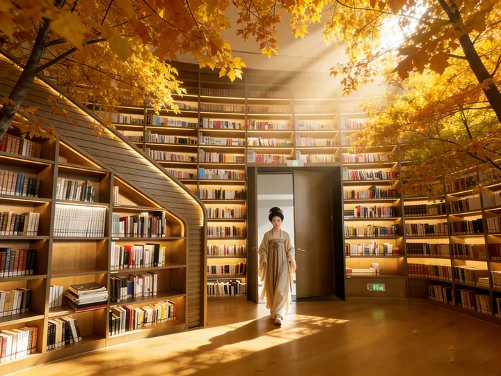 当宋制襦裙的素雅裙摆,掠过天府艺术公园图书馆的秋光廊道,时光仿佛在这一刻揉碎了边界。金黄的秋叶拥着上帝之光斜斜淌进窗,宋衣女子的身影或从木门轻步而出,或倚着落地窗凝望湖光,或踏着弧形阶梯缓缓行来,襦裙的纹路与书架的木纹缠在一起,墨香混着秋桂的甜,让现代书阁的硬朗线条,都被宋式的温婉晕染得柔软。 光在她的衣袂间流转,秋叶的金落在裙裾上,像撒了一把前朝的碎金。她走过满架的书,走过淌着光的窗,仿佛从宋词的韵脚里走出来的人,误入了这方秋光裹着墨香的天地,让“一叶落知天下秋”的诗意,在现代书阁里落得满地温柔。