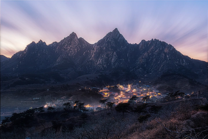 暮色漫过山脊,把大山的棱角揉进紫蓝的天幕里。流云被长曝光拉成柔丝,在黛色的峰峦上空舒展。山坳里的村落醒着暖黄的灯,星子似的缀在墨色的山腹间,像是大山捧在掌心的一簇烟火。 晚风掠过枯藤与松枝,把村落的细碎声响揉进山野的寂静里。此刻,巍峨的山是沉默的屏障,人间的灯火是温柔的回应,山海与烟火,就这样妥帖地相融在暮色里。