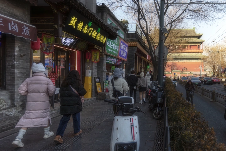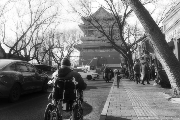 鼓楼在光秃的树杈间静立,灰砖叠着旧瓦,檐角挑起半卷云。穿厚棉袄的人坐在电动轮椅上,影子被斜阳拉得老长,朝着城楼的方向缓缓移动,像一尾慢游的鱼,穿过车流与树影织就的网。人行道上有行人踱步,店铺门口升腾着食物的热气,枝桠虽枯,却在天空写满舒展的线条,风从指缝溜过,带着城楼下传来的隐约鼓声,一下一下,敲在等待的心上。老城的冬日从不荒凉,只是把热烈藏得更深,等你靠近,才从每一道砖缝、每一缕风里,涌出滚烫的光。