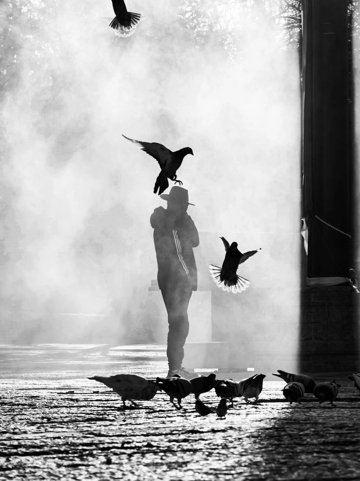 晨曦微露,晨烟弥漫在街头,一位戴礼帽的男子静静地站在那里,身姿挺拔,带着旧时光的韵味,身旁,几只鸽子展翅欲飞,像是灵动的音符,别具韵味。