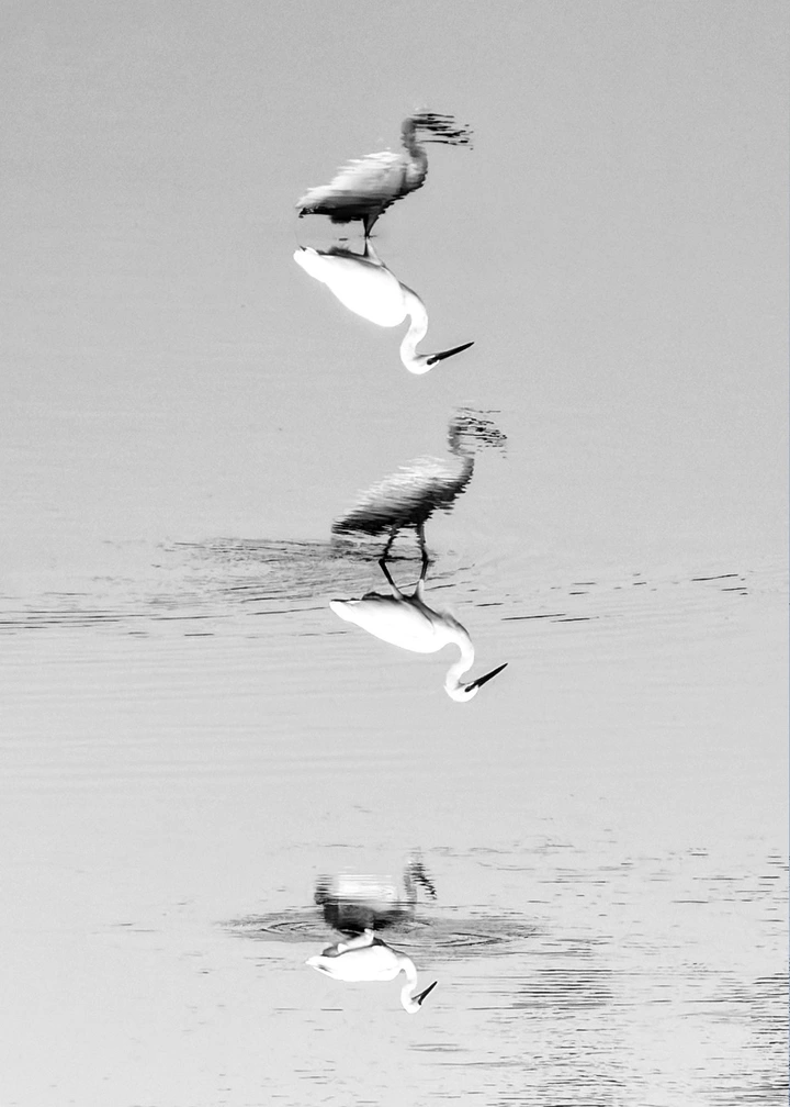 三只白鹭,三重倒影。在平静的水面上,现实与幻象交织,勾勒出生命的诗意与哲思。