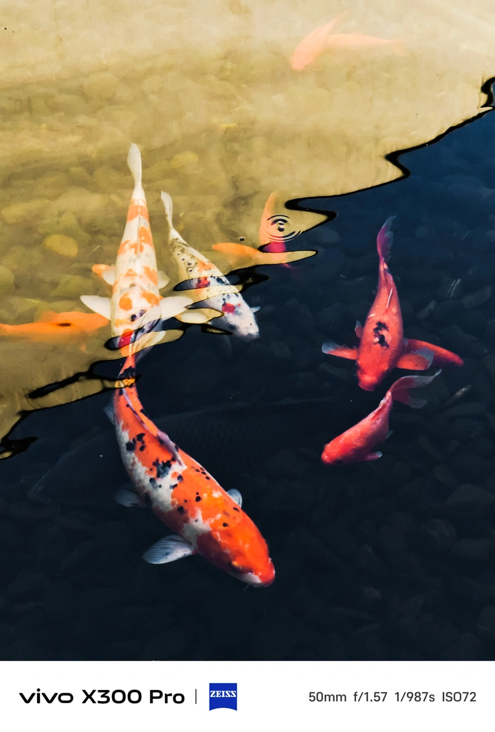 池面光影对半,锦鲤在明暗间游弋,金鳞逐水,漾开一汪温柔的东方意趣。