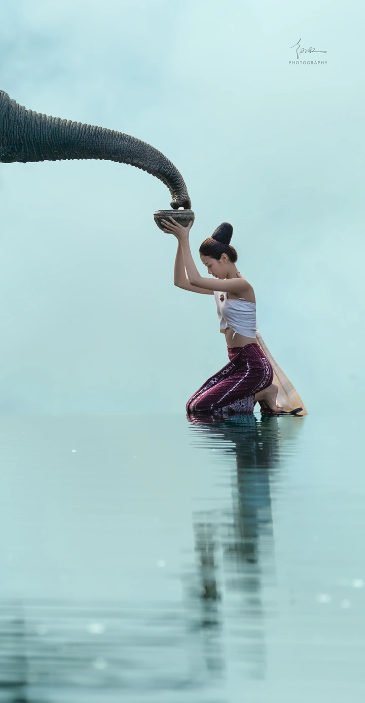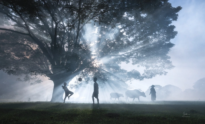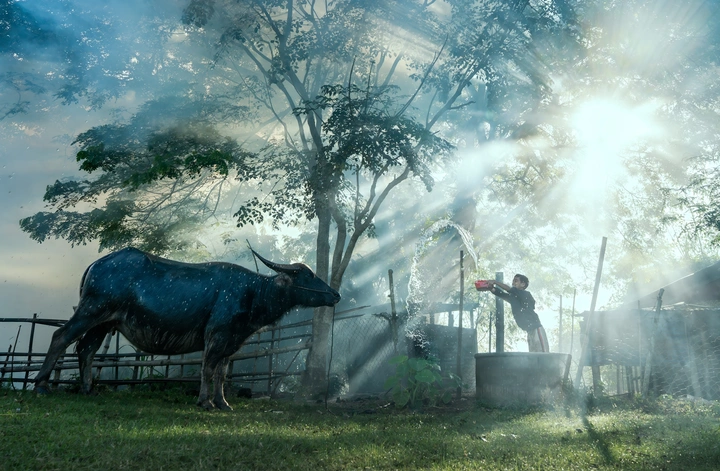 清晨的光,水牛静立,孩子扬起的浪花里藏着整个童年的欢畅。 ???