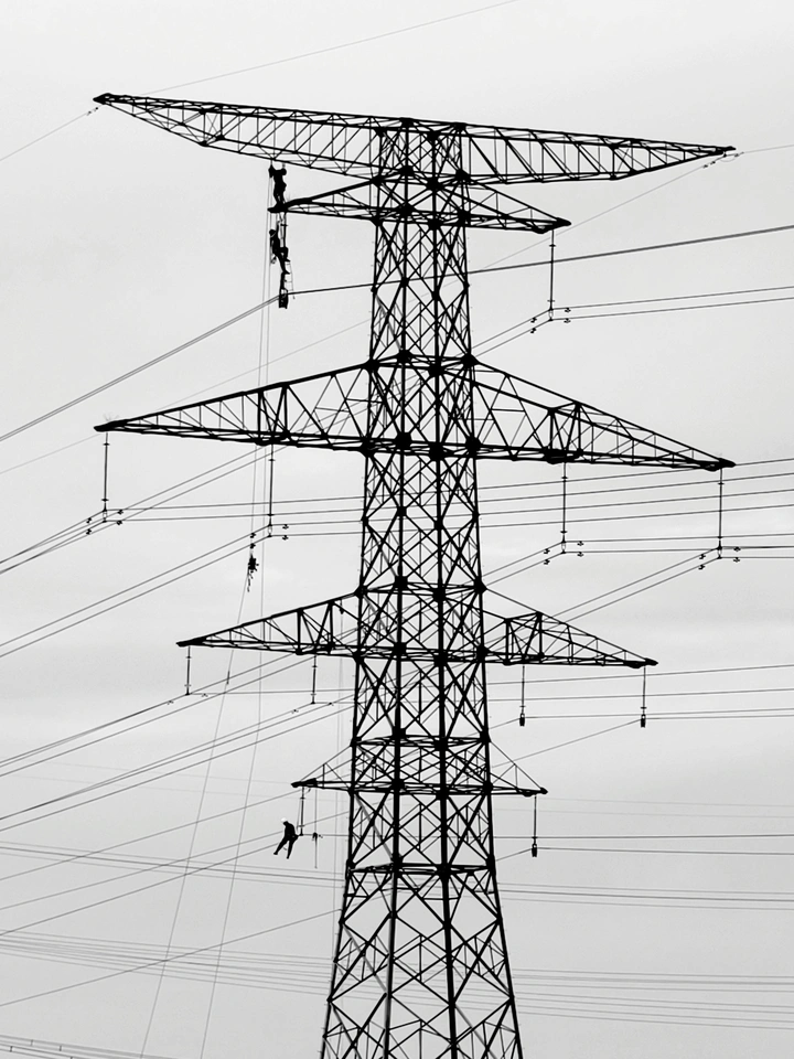 高压塔如巨型五线谱矗立天际,工人似跃动的音符悬于塔身。线缆如琴弦般向四方延展,工人在高空专注检修,安全绳与金属结构交织成工业乐章。