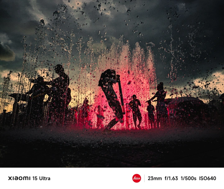 阴云密布的天空下,红色灯光将喷泉染成流动的火焰。孩童们或跳跃躲避水柱,或伸手触摸光影,水花与笑声交织成欢腾的乐章。喷泉高低错落的水柱如跃动的音符,在暗沉天幕下谱写出一曲充满神秘与活力的童年协奏曲,定格了雨后初霁时最纯粹的快乐瞬间。