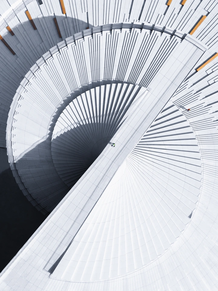 巨型螺旋如折扇徐徐展开的建筑,几何构件编织出秩序的经纬。渺小工人攀附于钢铁骨骼之上,现代建筑与传统意象在光影中碰撞,迸发出时空交错的震撼诗意。